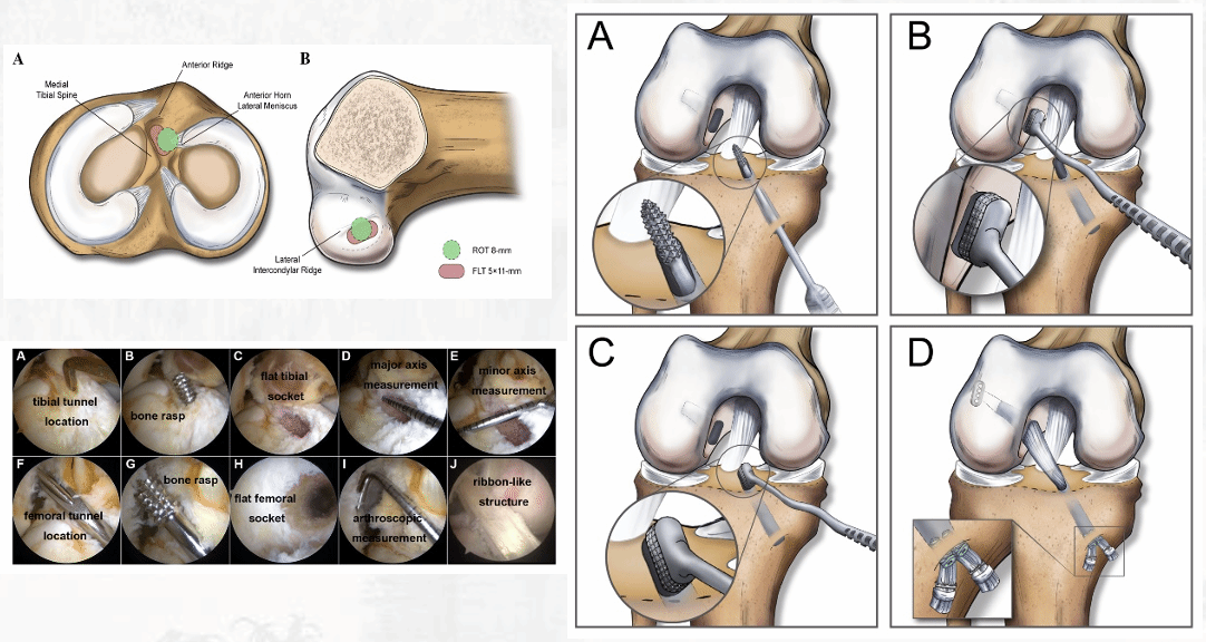 关节镜下个性化可调节骨道解剖重建 ACL 技术在手术过程中使用骨道锉锉修骨道,不同与圆矩形骨道钻,具备可调节性,满足个性化重建需要。胫骨止点定位沿“前内-后内”方向的骨性标志定位,避免损伤外侧半月板前角根部。