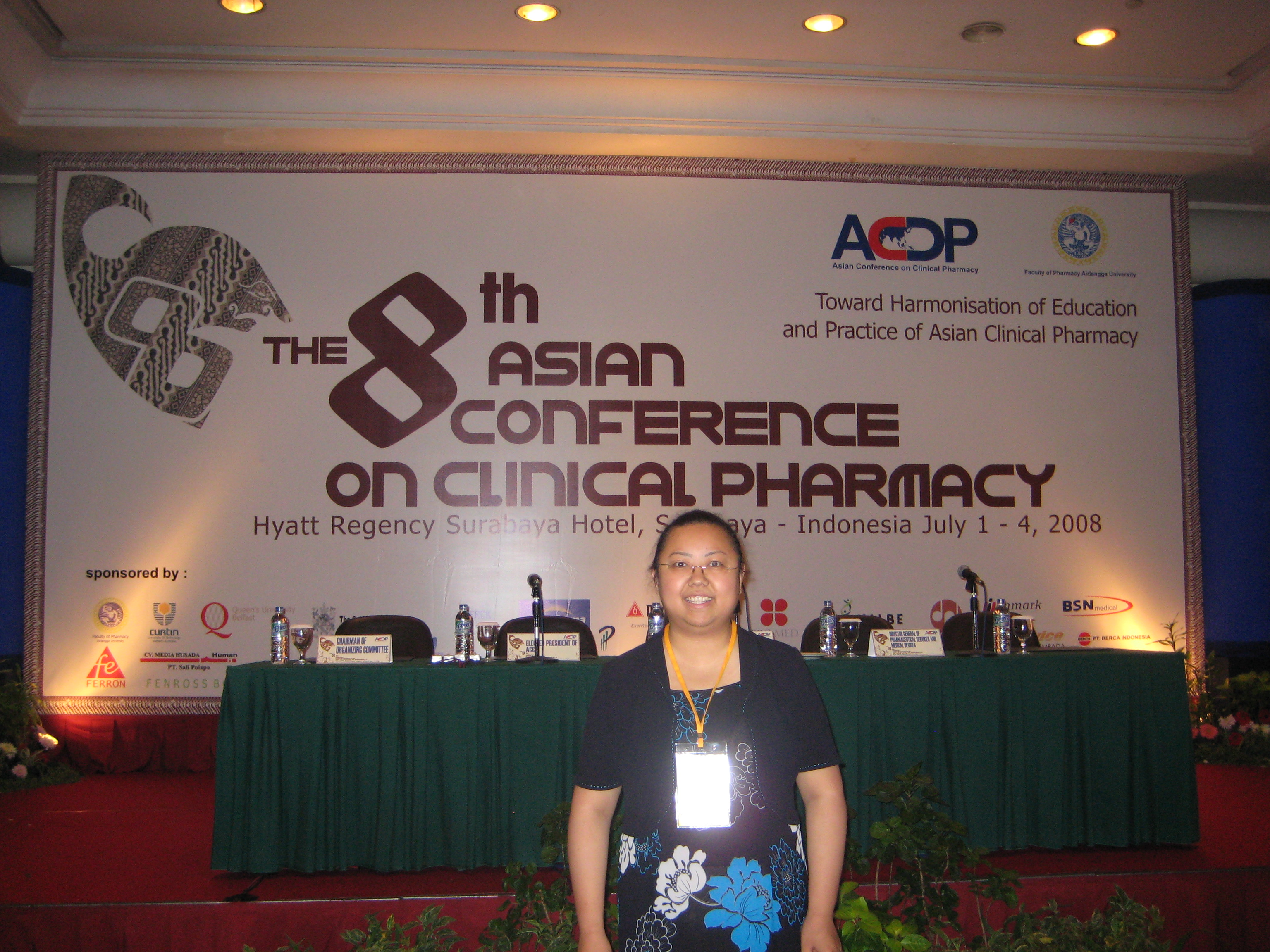 第8届亚洲临床药学大会于2008年7月1日至4日在印尼的苏腊巴亚召开。来自美国、加拿大、英国、澳大利亚的药学专家与亚洲各国的药学工作者就临床药学的研究、教育于实践作了充分的研讨与交流。中国药学会医院药学专业委员会也派出了20人的代表参会。中国代表团在会上进行了3个大会发言、2个分会场发言和4篇壁报,充分展示了我国临床药学工作的现状以及进展。我院药剂科段京莉副主任药师代表中国代表团就临床药学教育问题做了题为“clinical practice in 6 year education”的大会报告,获得了与会者的一致好评。很多国家的代表对我国临床药学的6年制教育表现出了浓厚的兴趣,并在会后纷纷表示愿意在这方面做更多的交流与合作。