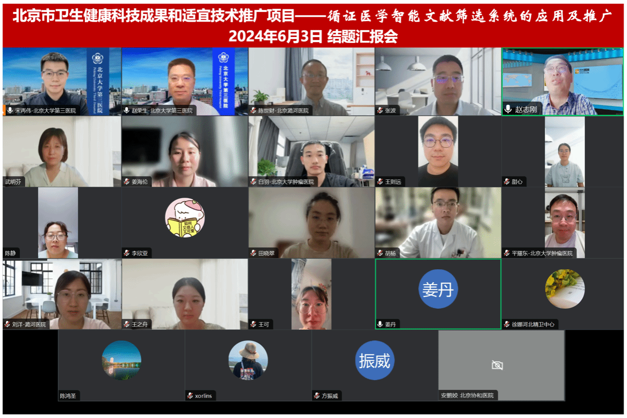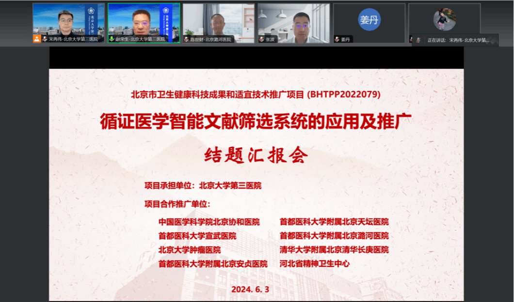 2024年6月3日,由我院药学部赵荣生教授团队牵头开展的北京市卫生健康科技成果和适宜技术推广项目“循证医学智能文献筛选系统(EBM AI-Reviewer)的应用及推广” (项目编号:BHTPP2022079)结题汇报会顺利召开。中国医学科学院北京协和医院、北京大学肿瘤医院、首都医科大学宣武医院、首都医科大学附属北京天坛医院、首都医科大学附属北京安贞医院、首都医科大学附属北京潞河医院、清华大学附属北京清华长庚医院、河北省精神卫生中心等8家合作推广单位的药学专家及药师参会。