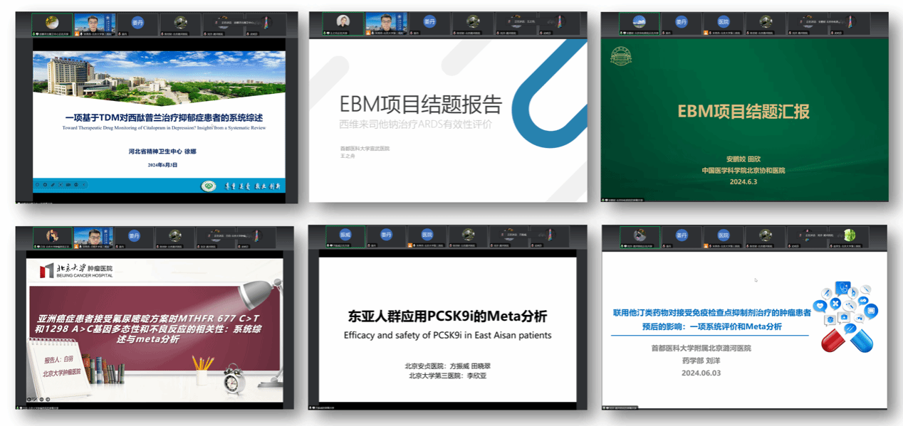 首都医科大学附属北京天坛医院武明芬副主任药师、首都医科大学附属北京安贞医院方振威副主任药师、北京大学肿瘤医院侯坤副主任药师、白羽主管药师、首都医科大学宣武医院王之舟主管药师、首都医科大学附属北京潞河医院刘洋主管药师、中国医学科学院北京协和医院安鹏姣、田欣药师等9位项目骨干成员分别就依托项目的循证药学研究选题、进展与成果进行了结题汇报,一致肯定EBM AI-Reviewer在助力循证药学研究与实践方面的突出成效。