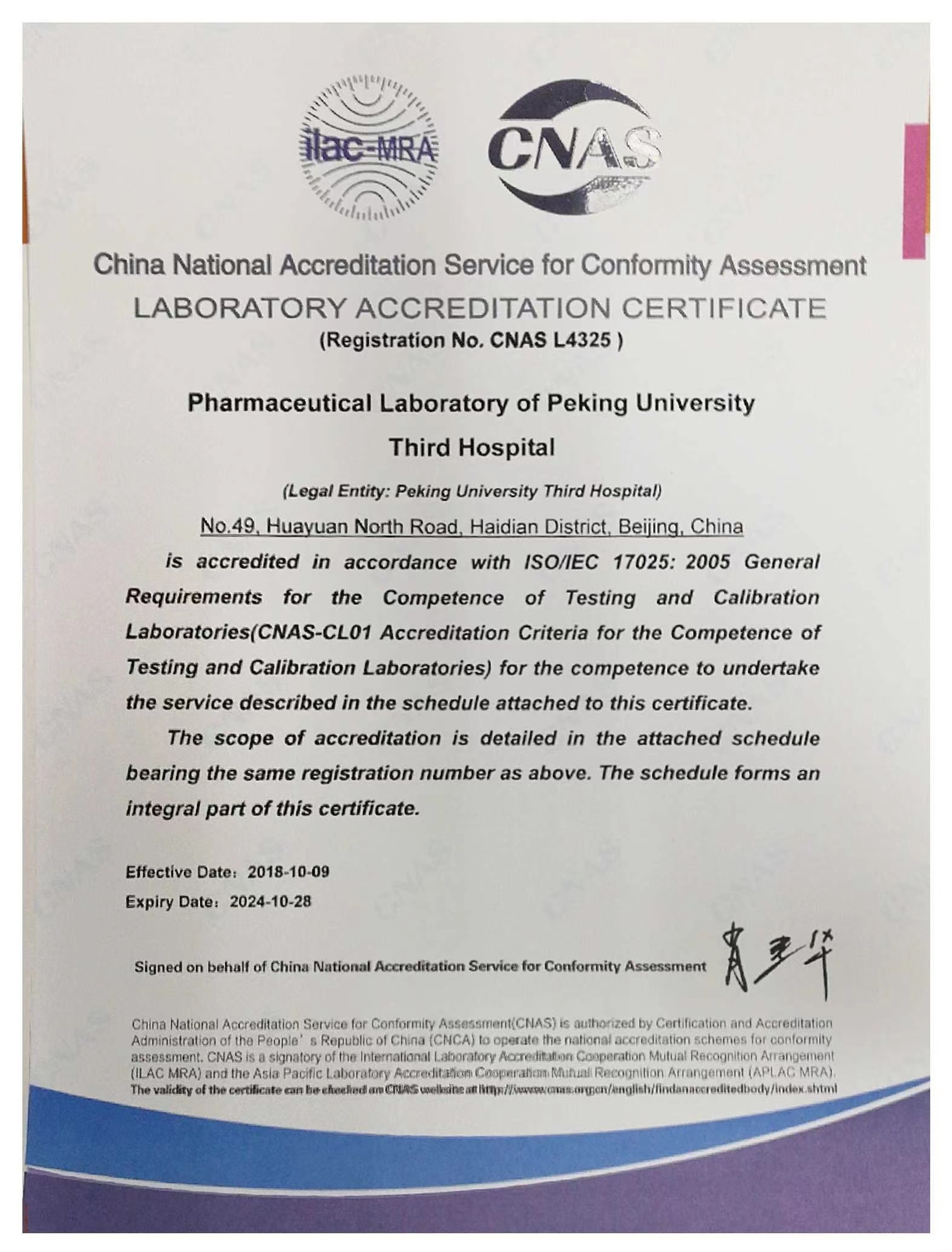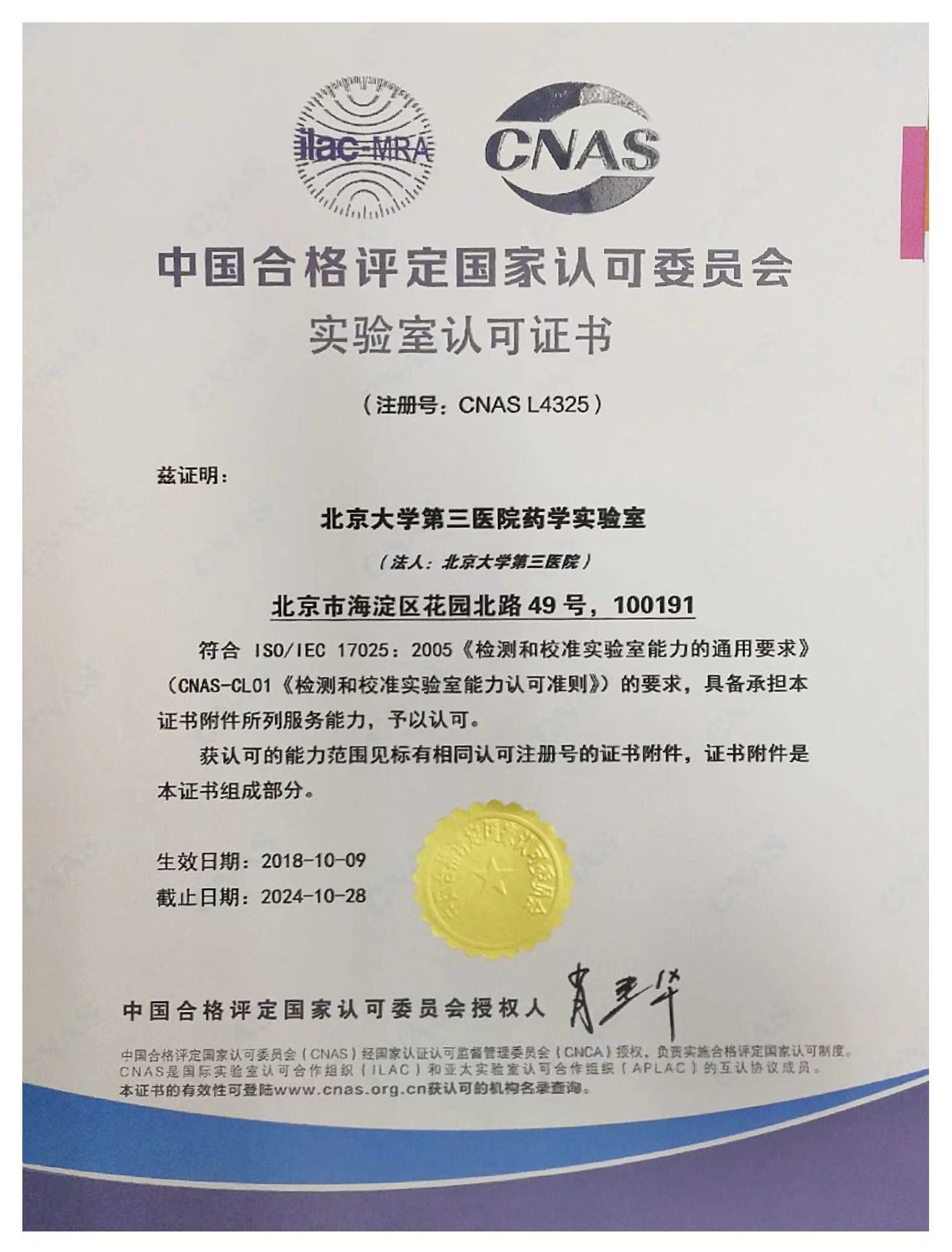 北京大学第三医院药学实验室(简称“实验室”),作为医院药物精准检测分析,利用现代化分析手段和药动学/药效学原理,为临床提供药物及小分析标志物精准检测平台,提高药物治疗水平及临床科研能力。