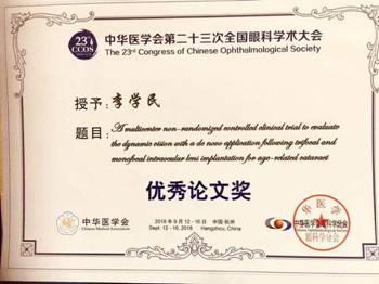 会议上,李学民教授与大家分享了老年性白内障植入单焦点或三焦点人工晶体术后的运动视觉差异,题为《A multicenter non-randomized controlled clinical trial to evaluate the dynamic vision with a de novo application following trifocal and monofocal intraocular lens implantation for age-related cataract》,内容精彩,深入人心。该题目突破性的将运动视觉加入到白内障的术后评估体系中,为白内障患者术后的全面评估奠定了基础。同时该论文获得了本次会议的优秀论文奖。