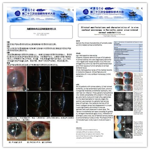 彭荣梅医师就《免疫性疾病所致角膜穿孔的个性化治疗》进行发言,详细分析我院因免疫性疾病导致角膜穿孔进行治疗患者的治疗方式、疗效及预后,总结出针对不同穿孔情况进行个体化治疗的策略及可能出现的并发症,具有很好的借鉴意义。有两个内容进行了电子壁报的展览,分别是《角膜移植术后层间积液处理方法》及《Clinical manifestations and characteristics of in vivo confocal microscopy in Varicella zoster virus-related corneal endotheliitis》。