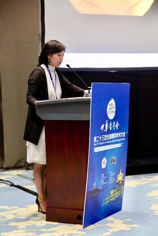 洪晶教授在此次会议上进行《中国角膜内皮移植手术十年回顾》专题发言,讲述了角膜内皮移植手术发展的历史,近年来我国开展的情况,及与国外的对比,总结国内外发的文章数量,认为中国复杂病人多,utra-DSAEK是比较合适中国病人,而DMEK还不是很成熟。此次会议上洪晶教授还对《糖皮质激素眼用制剂在角膜和眼表疾病治疗中应用的专家共识》进行解读;讲解了糖尿病角膜病变的诊治及儿童眨眼的病因分析。