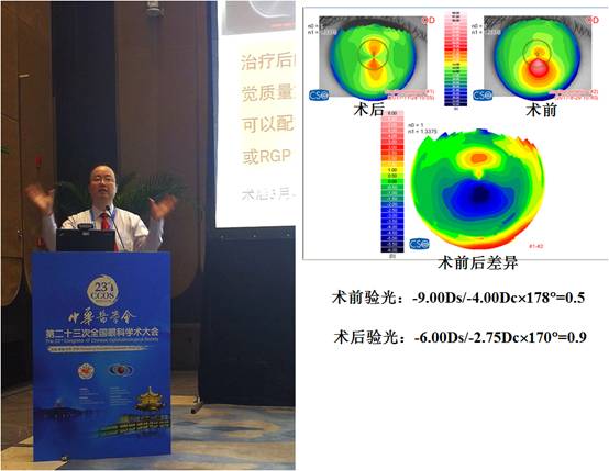 1.陈跃国教授在屈光手术专场进行了《角膜地形图引导的LASEK治疗圆锥角膜》的大会发言,以详实的数据表明:地形图引导个性化准分子激光角膜表层切削术联合快速角膜交联安全、有效,既可以阻止圆锥角膜的进展,又显著改善角膜的规则性,为圆锥角膜提供新的治疗方案。