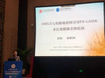 2. 张钰副教授在屈光手术专场进行论文发言,题目为《SMILE与角膜地形图引导FS-LASIK术后角膜像差的比较》,该研究发现角膜地形图引导FS-LASIK术后半年角膜总体成像质量优于SMILE,该结论与以往国内研究一边倒的认为SMILE术后视觉质量更优的结论不符,引起参会者的关注,将来需要前瞻性,随机的大样本研究来进一步证实。