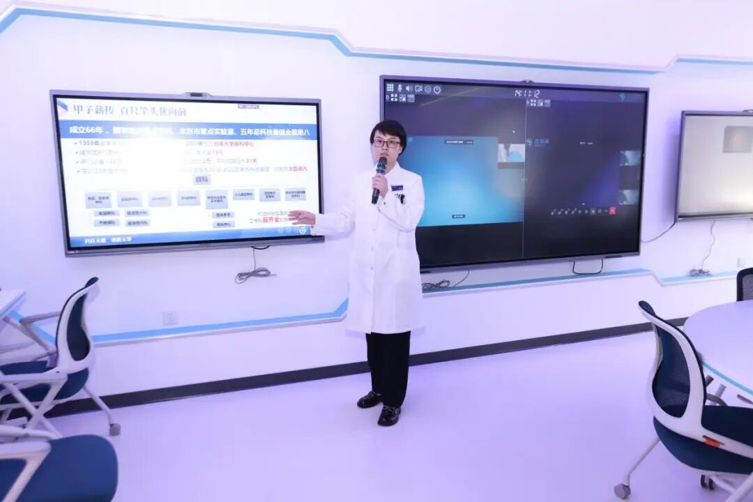 领导嘉宾在北医三院眼科彭荣梅教授的带领下参观了实验室,观看了我科自主研发创新产品的展示与介绍,现场观摩了中科院自动化所合作开发的模型演示、以及眼底AI、白内障AI、干眼AI等3款AI产品体验、4款原创模型的介绍。并应用远程手术指导系统连线宁波市眼科医院手术室,两院教授进行白内障手术实时交流,充分体现了智能医疗的互联与协同能力,以及AI技术在提升基层医疗服务能力方面的巨大潜力。
