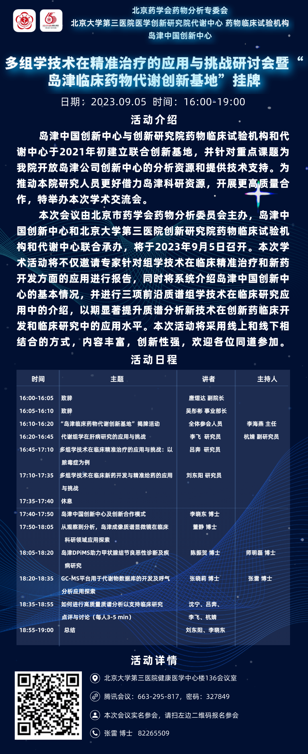 9月5日周二16:00-19:00将于【健康医学中心楼136会议室】举行《多组学技术在精准治疗的应用与挑战研讨会暨“岛津临床药物代谢创新基地”挂牌》学术活动,我们邀请到了华西医院李飞主任和湘雅三医院吕奔副院长等多位专家以及岛津公司的多位高级工程师为我们带来组学技术在临床精准治疗和新药开发方面的应用以及最新前沿技术的报告。本次学术活动线上线下同步举行,诚挚邀请各位感兴趣的老师和同学参加及讨论!报名方式详见海报二维码!