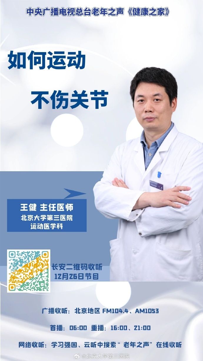 ——【中央广播电视总台】12月26日,运动医学科王健医生科普如何运动不伤关节。链接地址:https://ytweb.radio.cn/share/columnPlay?correlateId=968514538&columnId=1395696#