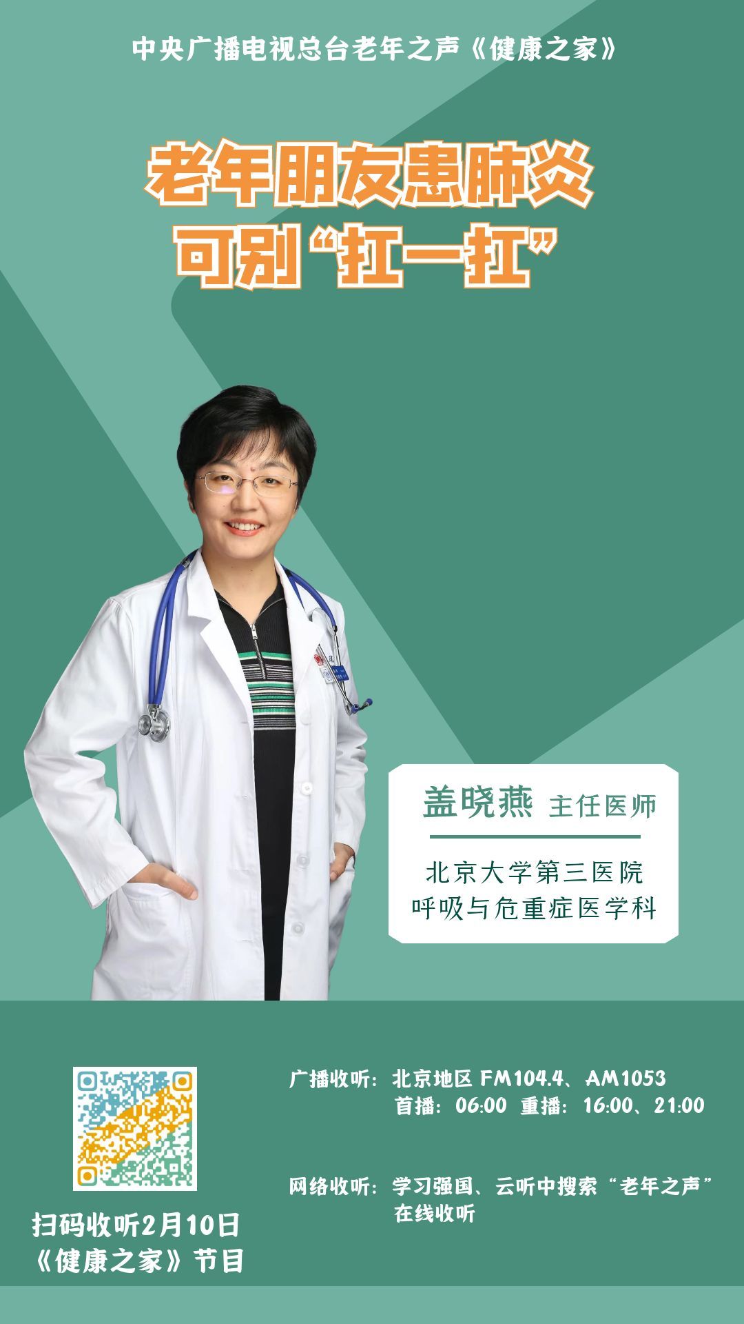 ——【中央广播电视总台】老年之声2月10日,呼吸与危重症医学科盖晓燕医生科普老年肺炎健康知识。链接地址:https://ytweb.radio.cn/share/columnPlay?correlateId=976849304&columnId=1395696&appUuid=AB20FAF6-ECF5-4798-894D-35E97705D8D4&appUserid=1cF17mNXGaILzALuUTB2SQ%3D%3D