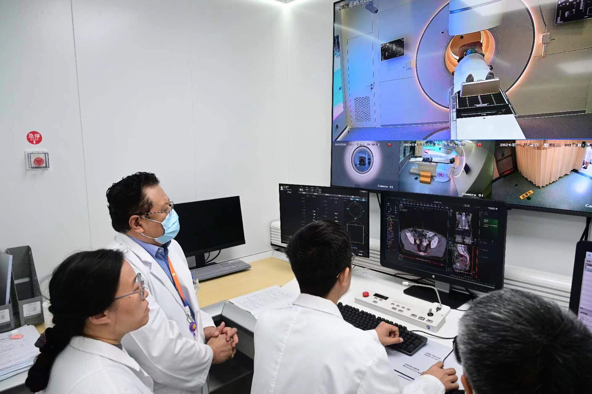2024年5月22日,在科主任王俊杰和副主任王皓的指导下,肿瘤放疗科医师,物理师,护士和技师团队团结协作,顺利完成首例基于联影506c直线加速器的All-In-One直肠癌新辅助放射治疗。此次治疗从定位、靶区勾画、计划制定到治疗实施共36分钟,标志着高效、便捷、精准放疗新时代拉开帷幕。
