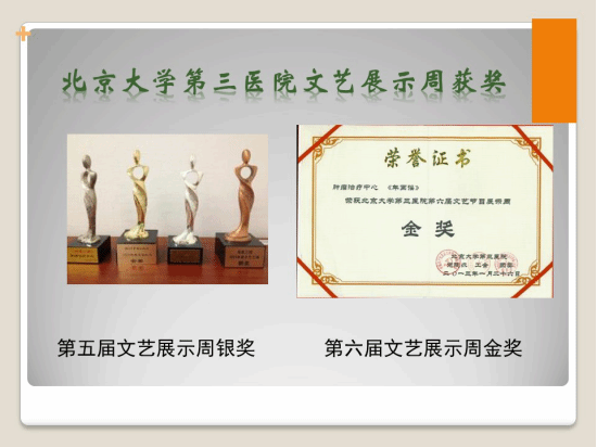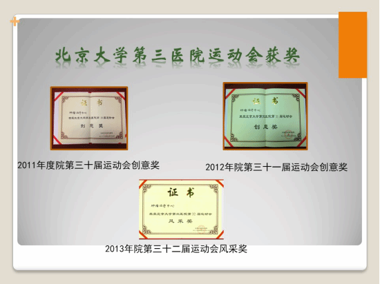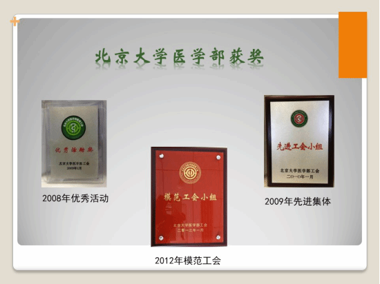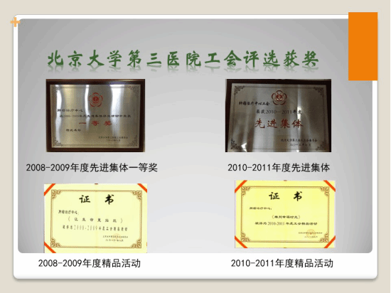 一分耕耘一分收获。多年来,全体职工不懈努力,取得了骄人的成绩:2008年“爱心之家”荣获医学部优秀活动奖,2009年我们荣获北大医学部先进工会小组,2012年获得了北京大学工会工作先进集体和北大医学部模范工会小组。北京大学第三医院工会的各项评比中,我们成绩斐然:多次荣获北京大学第三医院模范工会小组,主题活动多次被评为北京大学第三医院精品活动。我们重视成绩,更重视成绩背后的凝心聚力,更希望能将我们的科室建设成一个技术服务领先、职工爱戴、患者信赖的和谐之家。