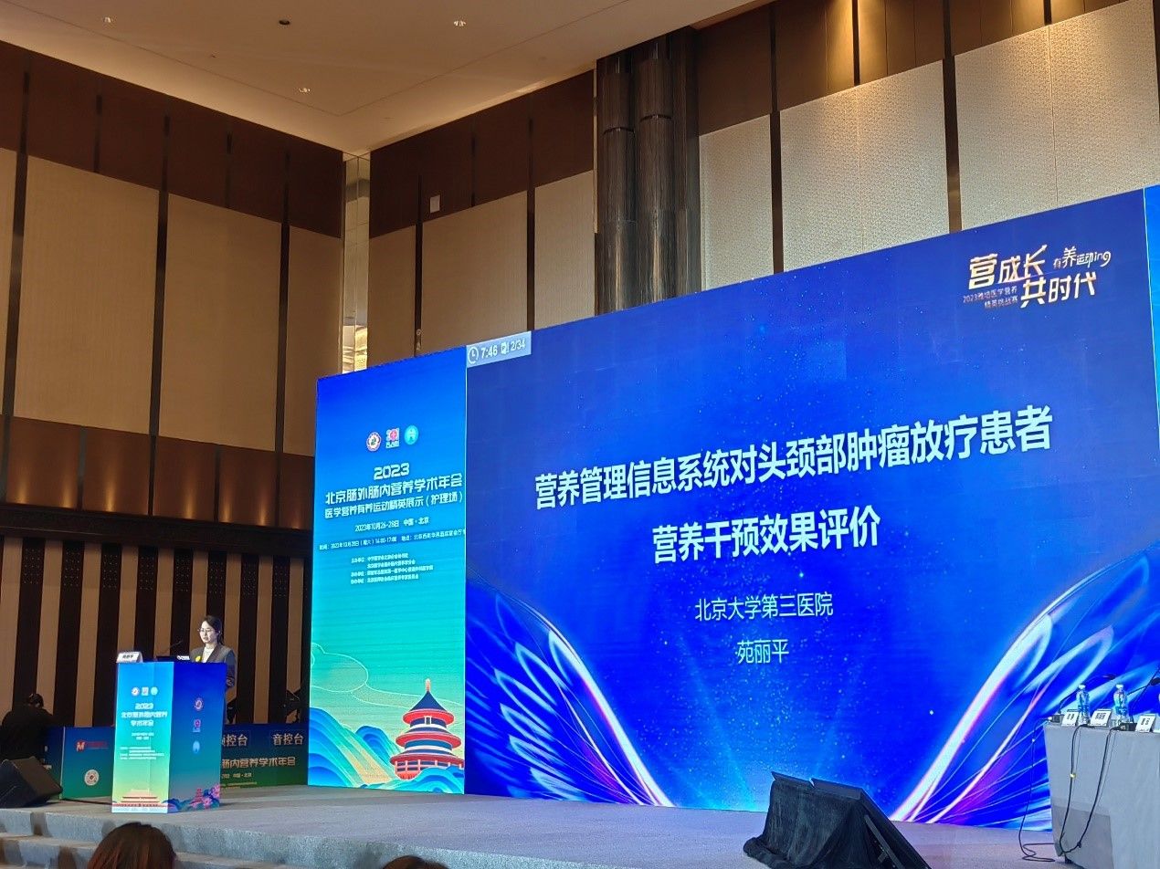 近年来,北医三院肿瘤放疗科,在肿瘤营养多学科MDT的基础上建设了一支有放疗特色的营养小组,定期开展医护营养诊疗培训,严格秉持规范化营养诊疗与质控,2022年12月,成功申报为中国抗癌协会规范化放疗营养治疗示范病房。做为营养小组成员的苑丽平,在此次活动中,以《营养管理信息系统对头颈部肿瘤放疗患者营养干预效果评价》为题,展示了放疗科在对头颈部肿瘤患者营养支持方面的研究成果和见解,充分体现了护理工作在患者营养管理过程中的重要作用,为以后临床实践提供了很好的借鉴。