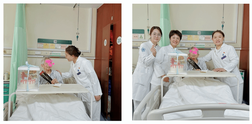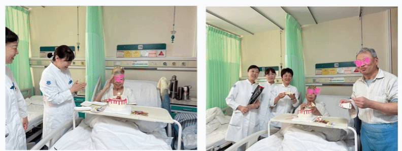 医护人员为患者献上生日鲜花和生日蛋糕,并送上亲笔手写的贺卡。祝愿刘奶奶生日快乐,早日战胜病魔,康复出院,与家人团圆。