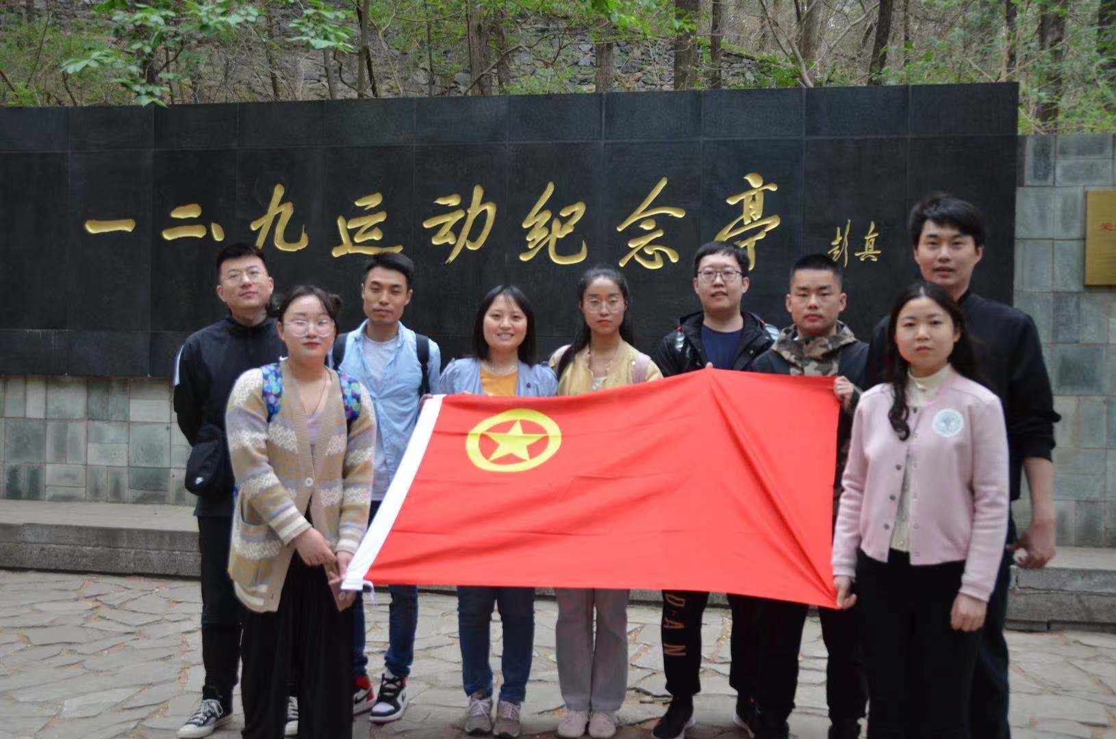 团支部一行重点参观了樱桃沟内著名景点 “一二九”运动纪念亭。关于这一景点有着太多峥嵘岁月的身影。“一二九”运动纪念亭位于“保卫华北”石刻对面,隔沟相望的石砌方院中,八个鎏金大字,是由全国人大常委会委员长彭真题写。共青团北京市委和北京市学联撰写的纪念碑文,由著名书法家刘柄森书写。纪念亭在纪念碑南侧,由三座三角形小亭组成,共青团北京市委员会和北京市学生联合会募捐建造。纪念亭由三座三角形小亭组成,创意是:三角形是“一二九”运动举办军事夏令营时露营帐篷的缩影。三个三角形组成一个立体的“众”字,寓意着广大民众的觉醒和人民众志成城抵抗侵略的决心。挺拔的建筑线条象征青年朝气蓬勃、积极向上的精神。大小三组建筑表示革命传统代代相传,革命事业后继有人。