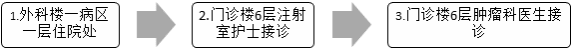 专家门诊开具日间病房(肿瘤化疗与放射病科十病房)住院单,当日进行住院预约及检查单缴费,住院预约在门诊楼6层肿瘤科日间病房医生办公室(房间号6034),如有CT、核磁、超声心电图等检查,缴费后需去相关科室预约检查日期。