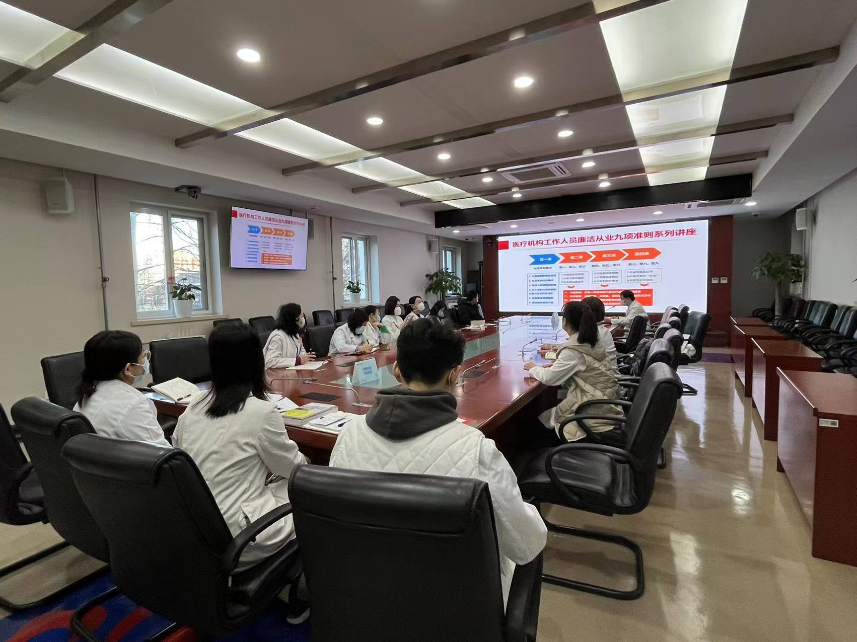 12月30日上午,党院办科室例会结束之后,党支部开展了纪检委员“每季一课”讲党课系列活动第四讲——《医疗机构工作人员廉洁从业九项准则——解读九项准则第7-9项》学习。党支部书记兼纪检委员姜雪同志以PPT形式对九项准则7-9项重点内容进行了深入解读。