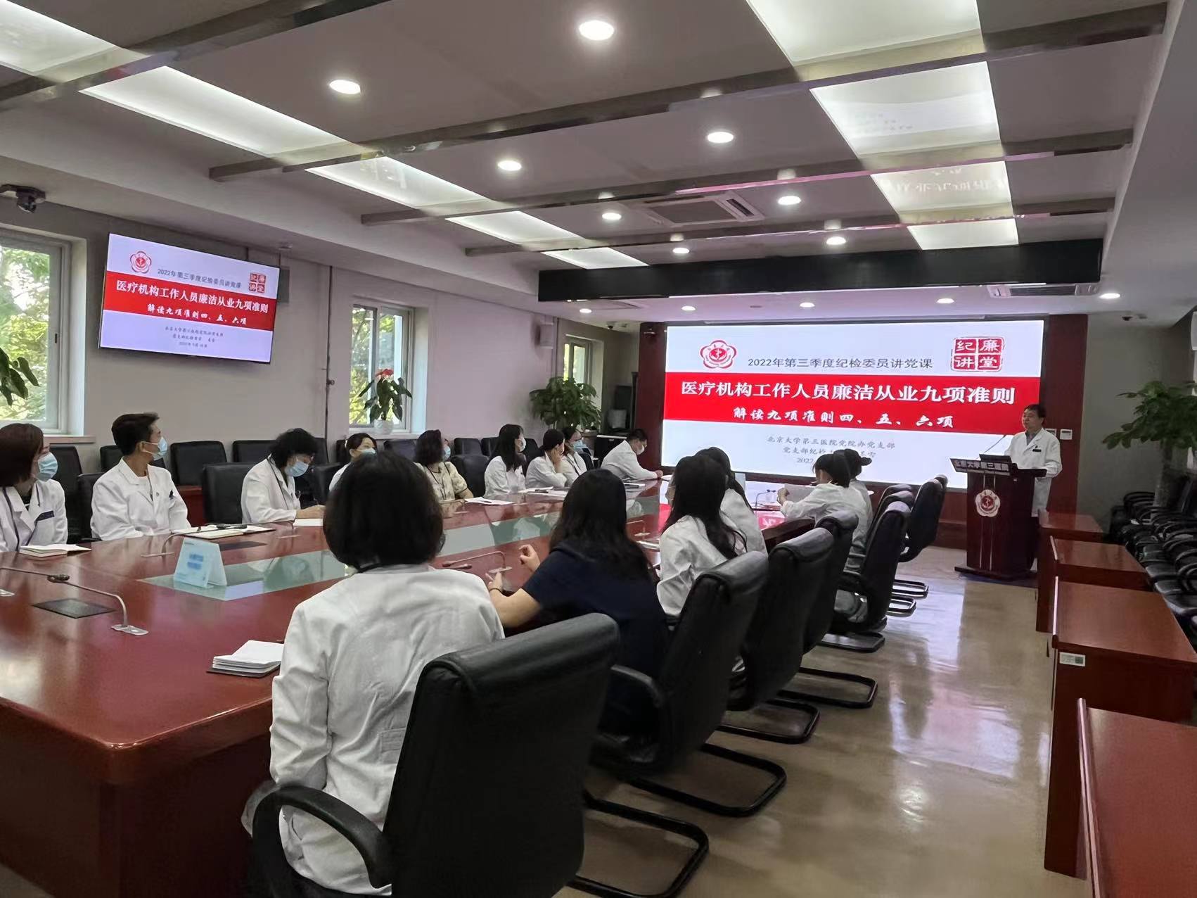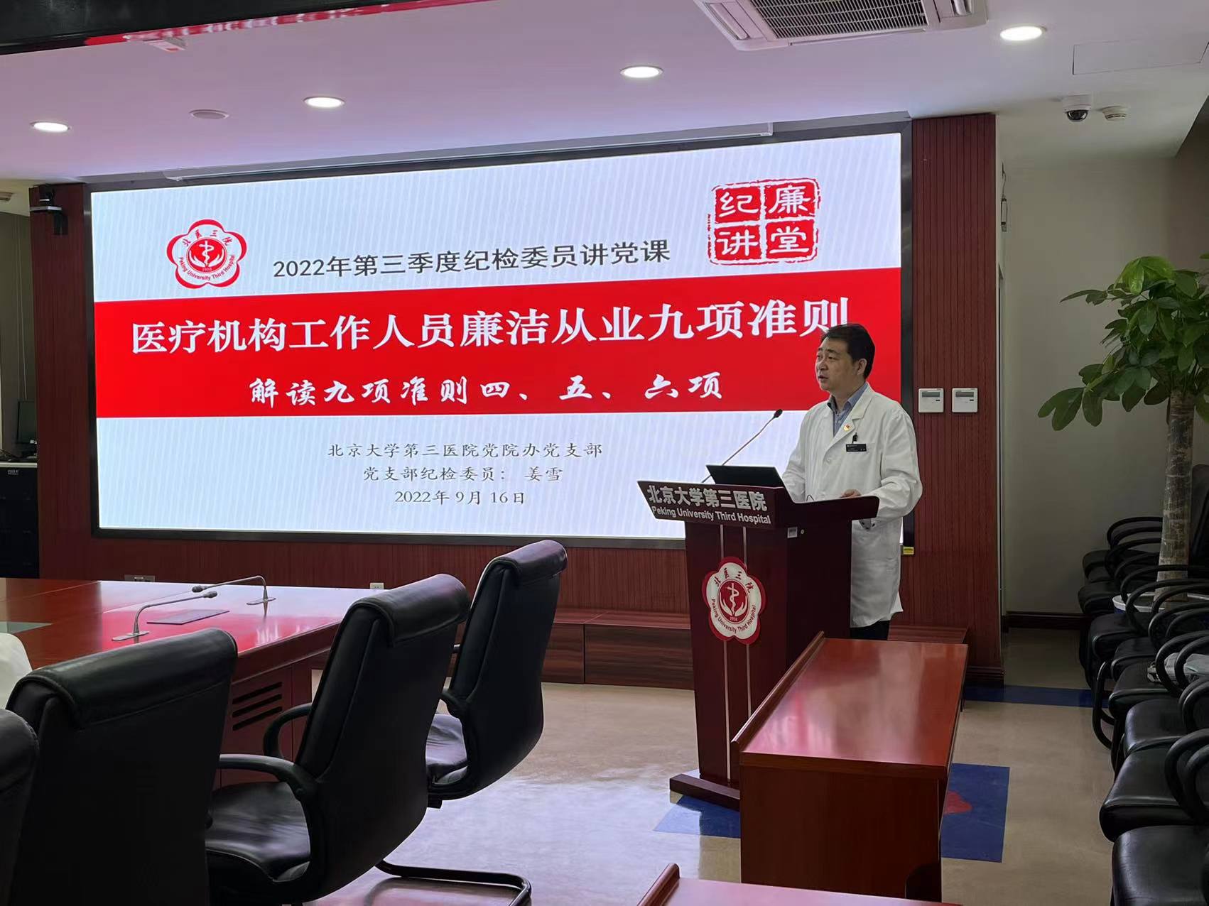 9月16日上午,党院办科室例会结束之后,党支部开展了纪检委员“每季一课”讲党课系列活动第三讲——《医疗机构工作人员廉洁从业九项准则——九项准则内容概述》和《医疗机构工作人员廉洁从业九项准则——解读九项准则第4-6项》学习。党支部书记兼纪检委员姜雪同志以PPT形式对九项准则4-6项重点内容进行了深入解读。