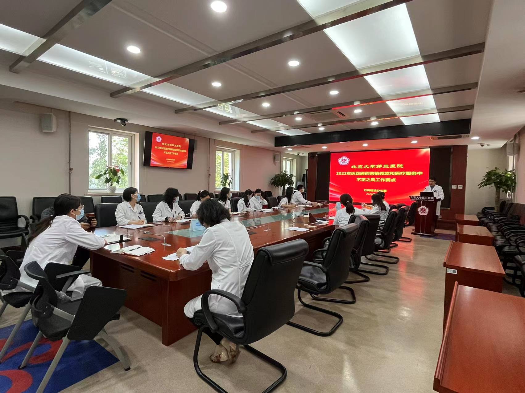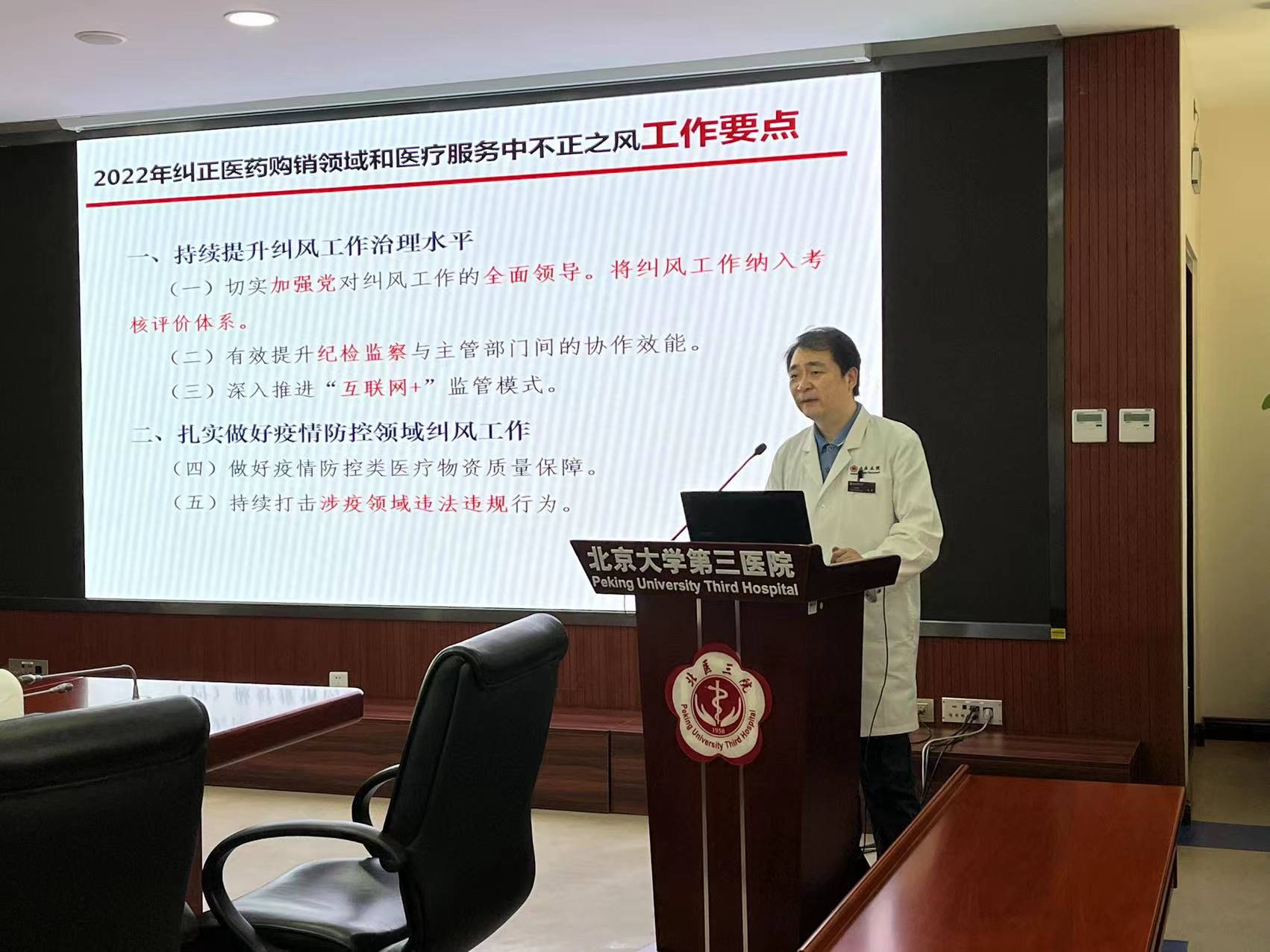 6月10日上午科会后,党院办党支部组织开展了2022年纠正医药购销领域和医疗服务中不正之风工作要点学习,党支部书记姜雪同志以PPT形式为大家传达了国家卫生健康委、工信部、公安部等九部委联合印发的通知,就2022年纠正医药购销领域和医疗服务中不正之风专项治理工作情况进行通报。根据《2022年纠正医药购销领域和医疗服务中不正之风工作要点》要求,医院严格落实 “党委统一领导、部门各负其责、纪检监察组织协调和监督检查”的纠风工作领导工作机制,开展重点领域的纠风工作和专项治理:坚决惩治“红包”、回扣等行风问题,持续推进“廉洁从业”;落实治理要求,杜绝违规推销宣传、直播带货等新型医疗乱象行为;持续加强医保基金监管,联合医保办开展规范使用医保基金专项治理;规范医务人员诊疗行为,建设以患者需求为导向的医院文化;加强廉洁纪律教育,联合纪委开展全员《九项准则》系列专题学习,加强廉洁生态营造;完善医院行风管理和惩处制度,建立行风信访沟通会商机制,落实“一案多查”。
