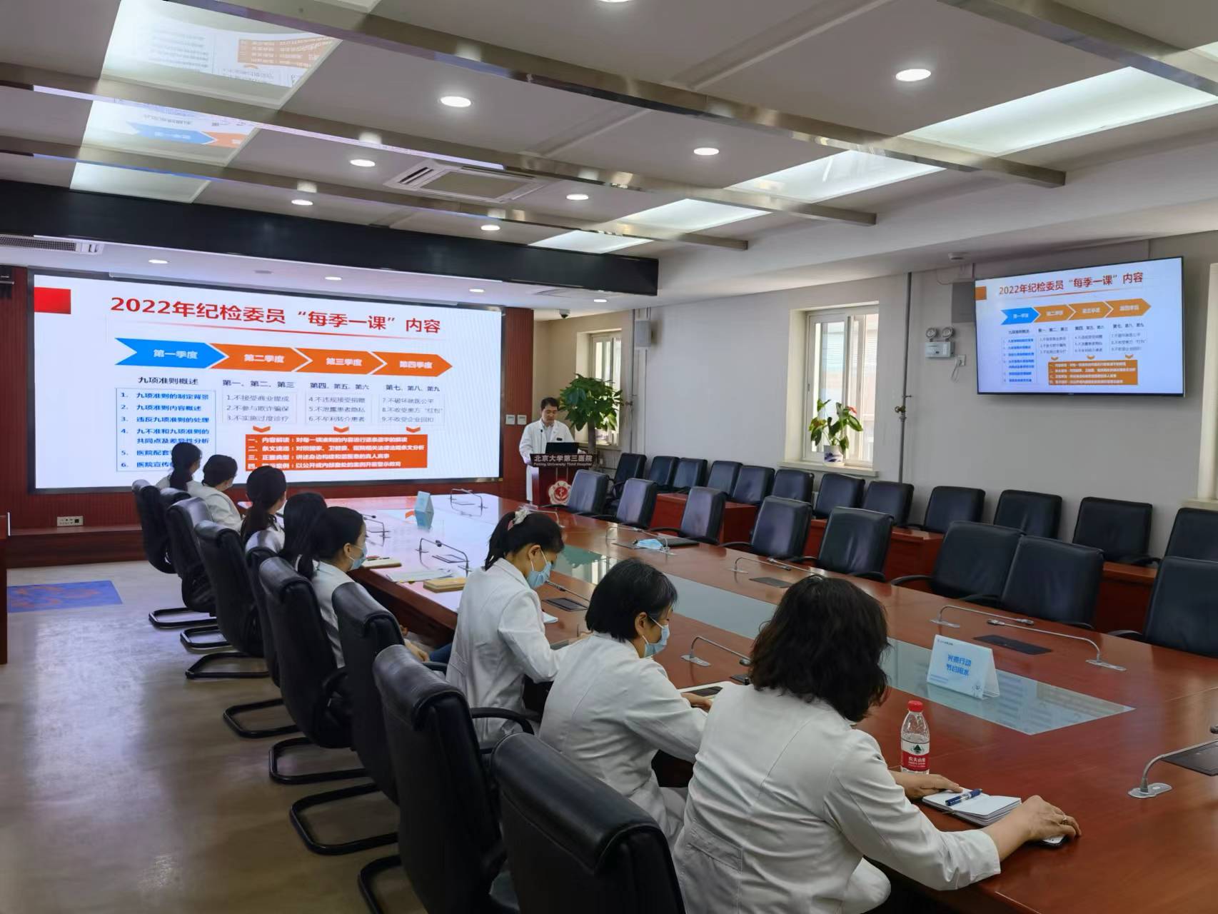 党院办党支部书记兼纪检委员姜雪同志为大家详细介绍了《医疗机构工作人员廉洁从业九项准则》的主要内容,从准则制定背景、框架和重点内容、国家和医院相关的惩处规定几个方面入手,姜主任深入浅出的进行了全面的阐释和梳理,并将“九项准则”与之前的“九不准”进行对比分析,帮助大家深刻理解准则内涵。