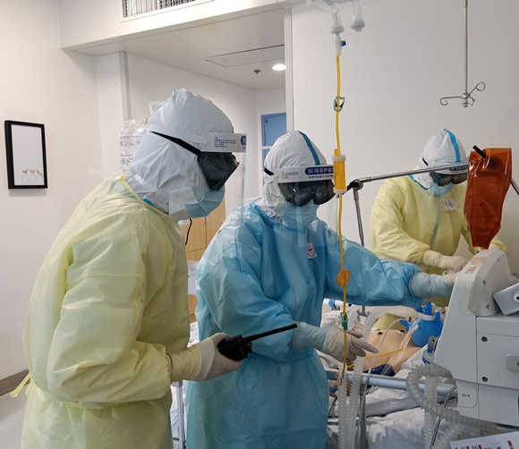 在北医三院援鄂医疗队独立接管的危重症病房内,急诊科医生田慈(左二)和同事正检查患者各项监测指标。北医三院供图 白衣战士抗疫日记 重症病房传来喜讯 2月19日 武汉同济医院 晴 王明春 国家援鄂医疗队队员、北医...