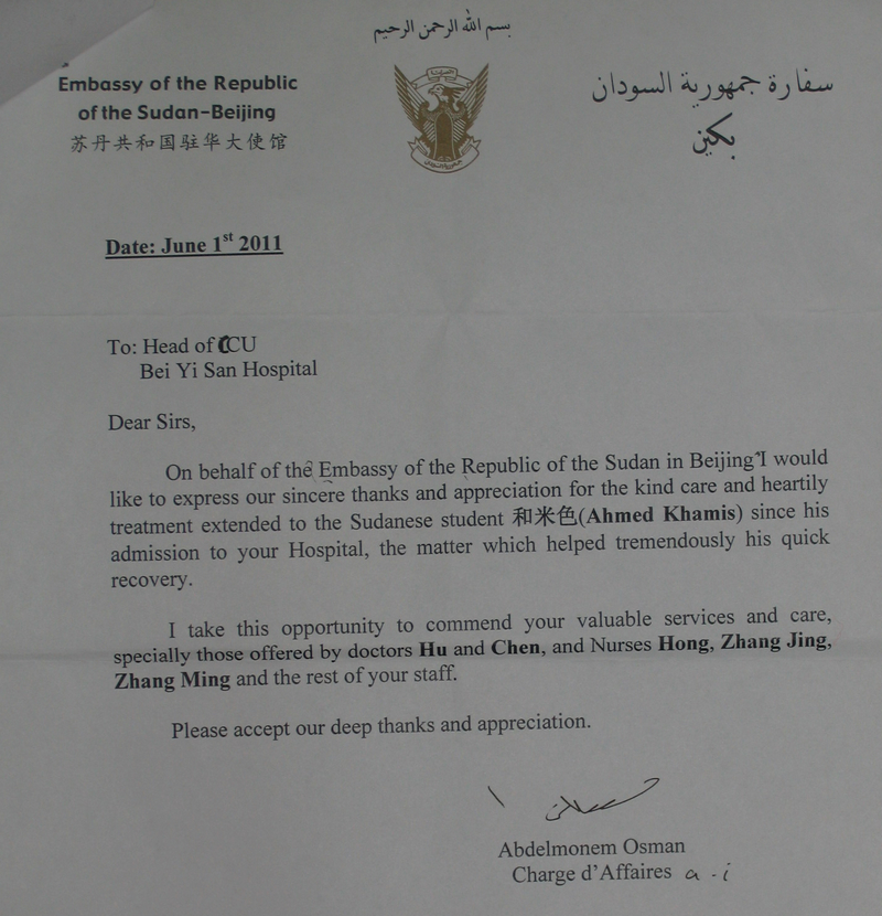 苏丹共和国驻华大使馆 2011年6月1日 致北医三院CCU的领导们: 亲爱的工作人员,我代表苏丹共和国驻华大使馆对贵院给予我国学生和米色的热心照顾和精心的治疗表示诚挚的感谢,你们的精心照料使他很快地康复了。 我借此...