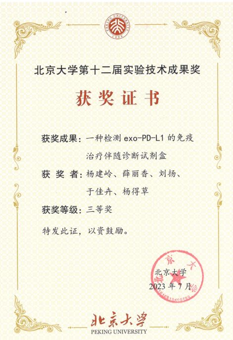 2023年6月28日,北京大学医学部设备与实验室管理处组织“北京大学第十二届实验技术成果奖(医学组)现场答辩工作,我科室杨建岭及其团队申报的项目《一种检测exo-PD-L1的免疫治疗伴随诊断试剂盒》获得北京大学实验技术成果三等奖。