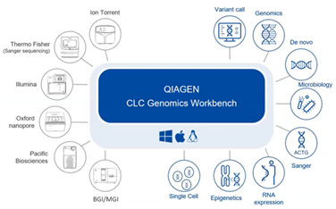 CLC GxWB 是一款综合性生物信息学分析工具,可提供针对不同应用的数据分析工具和模块,分析对象包括二代和三代测序数据拼接、转录组差异基因分析、重测序变异检测、单细胞转录组测序数据分析、单细胞TCR 测序数据分析、甲基化测序数据分析、ChIP-seq数据分析、微生物宏基因组数据分析、微生物扩增子数据分析、病原微生物分型等。