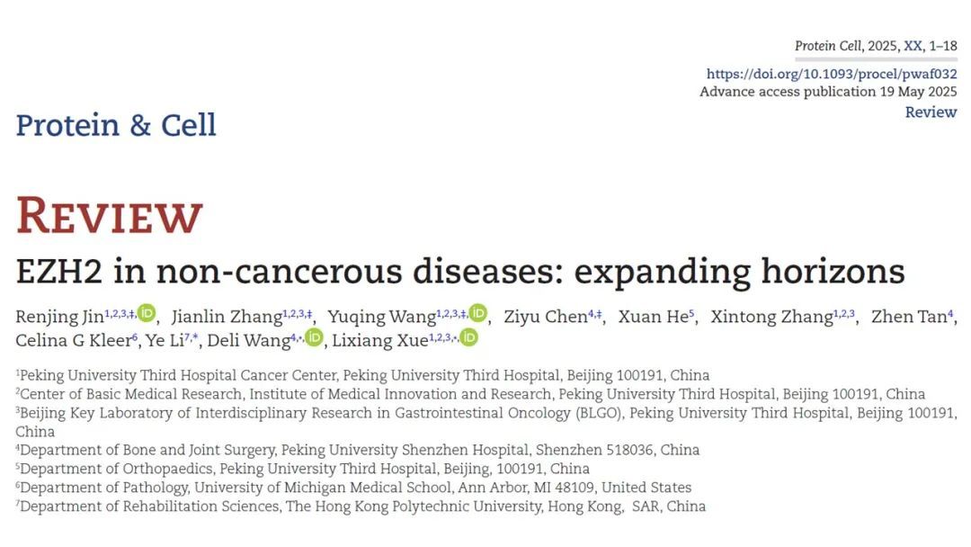 近日,北京大学第三医院肿瘤中心薛丽香教授团队联合国内外专家在Protein & Cell发表的最新综述“EZH2 in Non-Cancerous Diseases: Expanding Horizons”中,首次系统阐述了EZH2在自身免疫病、纤维化疾病、代谢性疾病和神经退行性疾病等非肿瘤疾病中的“多面手”角色。该综述不仅系统归纳了EZH2在上述非瘤疾病中的病理作用,更为相关疾病的精准治疗提供了新思路和新范式。