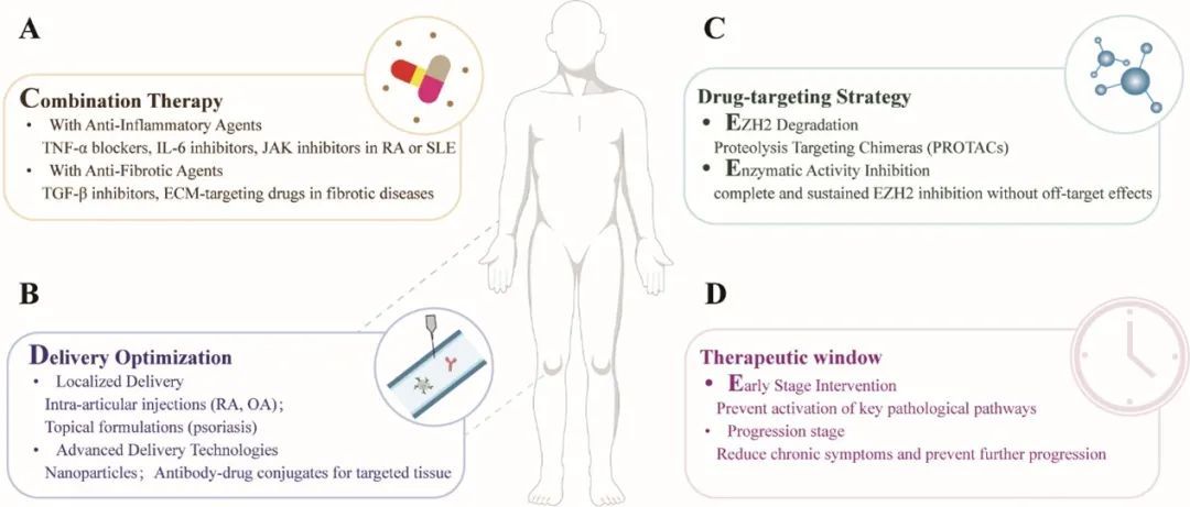 在未来EZH2抑制剂的瘤外应用中,作者提出了“CDE3”模型(图1):① Combination therapy(组合策略):通过联用抗炎药物或抗纤维化药物,实现多通路协同调控。②Delivery optimization(递送优化):开发靶向纳米颗粒、抗体偶联药物,提升组织靶向性。③ EZH2 direct degradation(降解策略):利用PROTACs等前沿技术,直接降解EZH2蛋白本身。④ EZH2 activity inhibition(酶活抑制):优化EZH2酶活抑制剂,实现更有效和持久的EZH2酶活抑制作用,减少潜在的脱靶效应。⑤ Early stage intervention(早期干预):在不可逆损伤发生前,尽早进行表观遗传干预。该模型为克服现有疗法局限性提供了系统解决方案,尤其适用于需长期管理的慢性疾病。