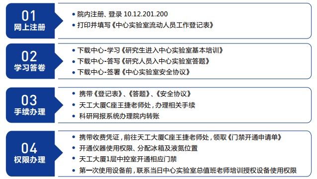 中心实验室可为我院科研人员提供实验场地及实验设备,进入中心实验室工作需参照以下工作流程办理入室手续。具体包括:网上注册、学习答卷、手续办理及权限办理。
