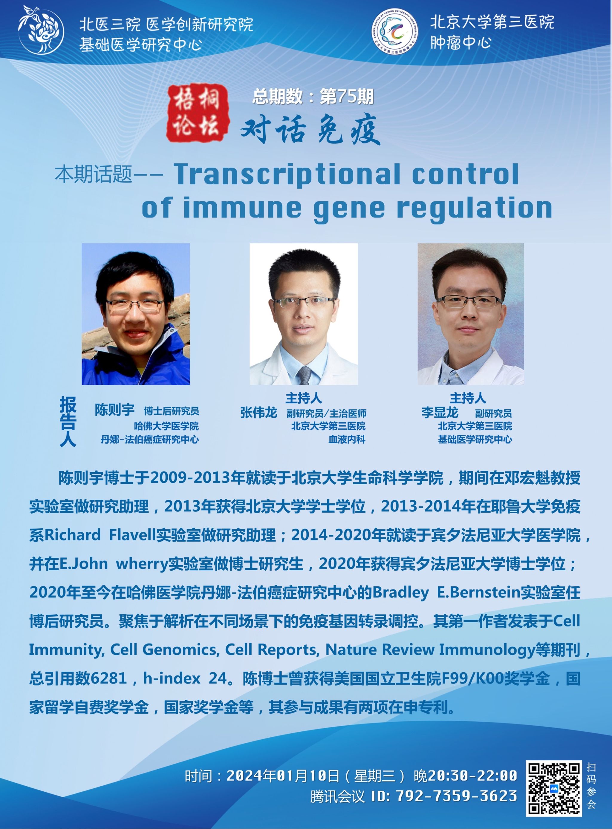 1.报告人:陈则宇(哈佛大学医学院 丹娜-法伯癌症研究中心 博士后研究员),报告题目:Transcriptional control of immune gene regulation