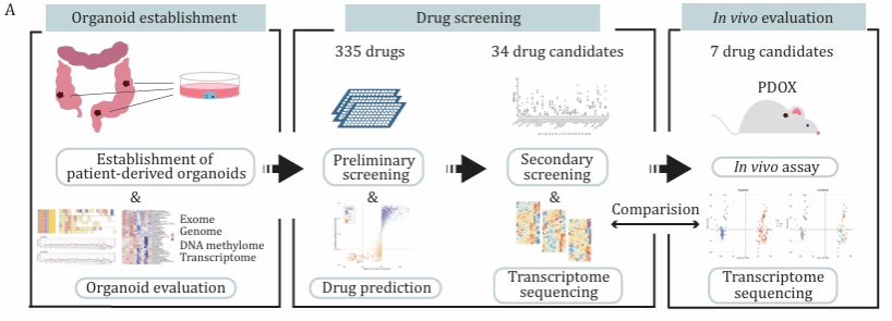 北京大学第三医院普通外科付卫教授团队与北京大学生物医学前沿创新中心(BIOPIC)汤富酬课题组合作,成功建立了基于人类结直肠癌类器官模型的体外药物筛选和药效评价平台。采用“老药新用”的策略,使用小分子药物体外筛选手段并经过类器官移植瘤小鼠模型(patient-derived organoids-based xenograft, PDOX)体内实验验证,得到多种具有潜在结直肠癌治疗价值的候选药物,并在转录组水平对候选药物的作用机制进行深入解析。