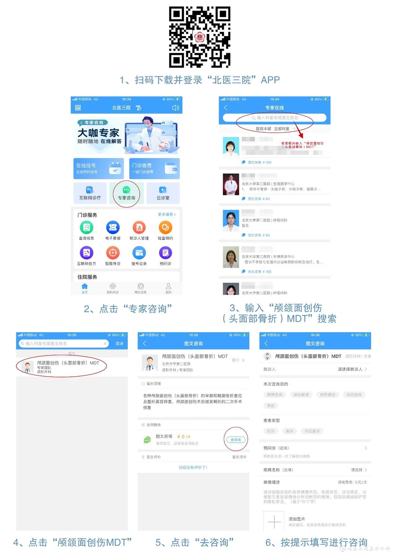 扫码下载并登录“北医三院”APP → 点击“专家咨询” → 输入“颅颌面创伤(头面部骨折)MDT”搜索 → 点击“颅颌面创伤MDT” → 点击“去咨询”