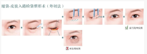 对应术式:处理这种眼袋,需要采用外切法祛眼袋(经皮肤入路),不止要去除眶隔脂肪,还需切除适量松弛的皮肤并收紧提升。