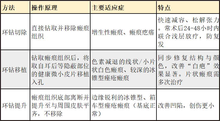 环钻,本是皮肤科用于病理取材的微型器械。将其应用于瘢痕治疗,原理是在瘢痕区域进行高密度、微创的“打孔”,根据修复目的不同,孔径可以从0.6-4.0毫米。通过钻取并移除部分瘢痕组织核心,达到三大关键目的: