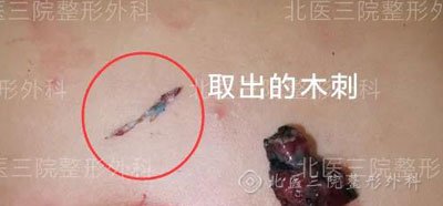 小朋友B同样进行了MRI相关检查后,显示有异物,手术方案:彻底清创+探查伤口+异物取出(约3cm长的木刺),皮瓣修复创面。