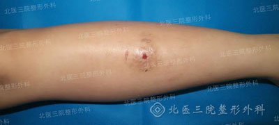 小朋友A:伤口位于左小腿,比较表浅,是因1年前走路不小心摔倒地上造成了左小腿外伤,当时在当地医院进行了清创缝合,然而两个月不到,原来切口的地方出现了破溃,但是没有红肿疼痛,然后又就诊于多家医院,并进行了多次清创处理,还是反复愈合、破溃,没有明显的好转迹象,才来到我科进一步治疗。