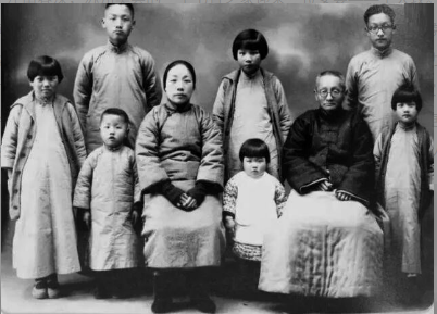 [1933年,王大玫一家,前排右起:王大珍、王应伟(父亲)、王大瑛、周秀清(母亲)、王大瑜、王大琬,后排右起:王大珩、王大玫、王大琪]