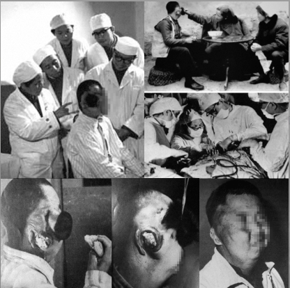 [1979年,王大玫(左一)为“双头人”患者做检查及手术]