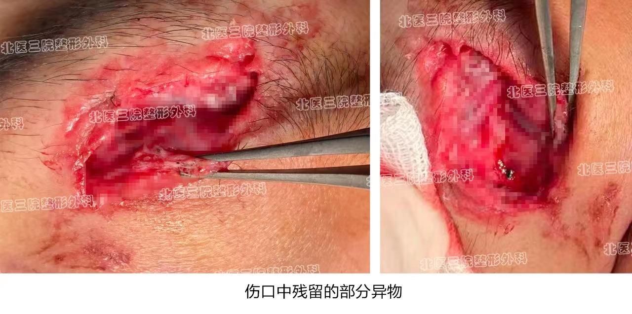 我科曾接诊一位急诊患者,面部外伤后就近找医院进行了紧急缝合,伤后第二天发现伤口缝合针脚宽大粗糙,到我科要求进行美容缝合。我们医生经过术前仔细评估后,为患者进行了二次清创及整形美容修复术,二次清创时发现伤口内还残留了些许沙土等异物。
