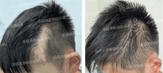 下面这位10岁患儿就是因为头皮扩张器术后遗留了疤痕,我们医生根据患儿情况采用毛发移植技术为其治疗,一年后患者复查,可以看到头皮瘢痕处移植后的毛发生长良好且自然