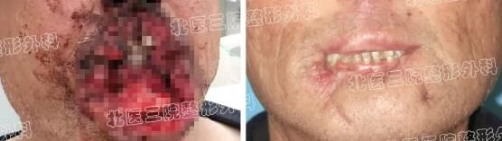 这是比较严重的颌面部挫裂伤,看起来比较糟乱,伴有严重的皮肤缺损,经过整形外科急诊创伤修复完全修复了上唇,部分修复了下唇,很好地闭合了创面,并为二期手术修复做好了准备和铺垫,但遗留痕迹较明显。损伤机制简单来说有两种: