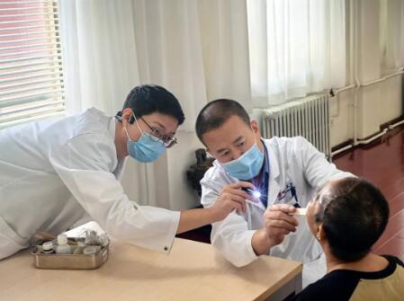 北医三院整形外科毕洪森主任与张沛阳医生为前来复诊的急诊颅颌面创伤患者仔细检查