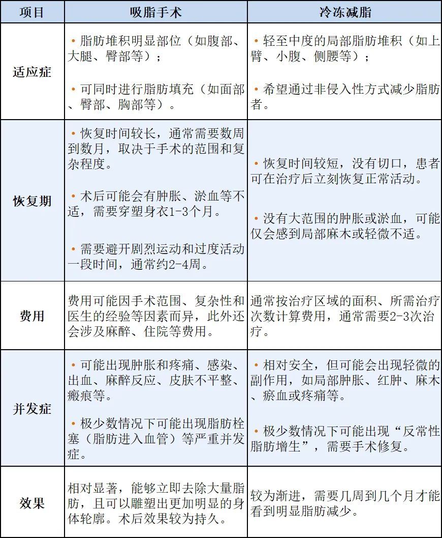 综上,两种减脂方法都有各自适应症及特点,如果您追求快速显著的效果,并且愿意经历长时间的恢复期和承担可能的风险,吸脂手术可能是较好的选择;如果您希望通过非侵入性的方法逐渐减少脂肪,且不想经历长时间的恢复期,冷冻减脂是一个不错的选择。最终选择哪种方法,需要结合您的个人需求以及专业医生综合评估后的专业建议,制定最适合的方案。