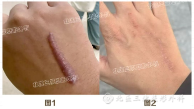 一、我们曾接诊一位外院手部骨折术后的患者,其伤口仅采用了皮内缝合(未行充分皮下减张),愈合后形成了明显的凸起疤痕(如图1)。加之,手部活动多、张力大,是疤痕高发部位。我们为他进行了疤痕切除,并严格执行了皮下减张缝合与外层精细缝合,半年后疤痕的宽度和凸起度均得到显著改善,但患者因户外训练需求,无法做到充分防晒抗疤、且手部活动量大,半年后,其新生瘢痕已趋于稳定,呈线性平整状态,患者对此次修复表示满意(如图2)。若后期对外形有更高要求,还可进一步改善。