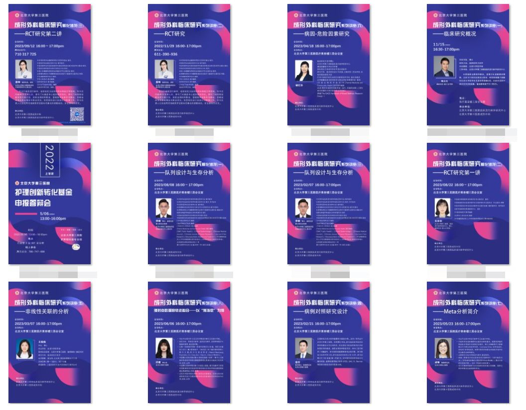 成形外科举办临床研究系列讲座,主题分别为:临床研究概况、队列设计与生存分析、RCT研究、病因-危险因素研究、非线性关联的分析、病例对照研究设计、Meta分析简介等。