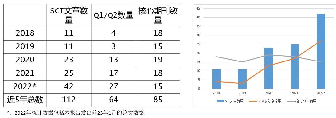 成形外科近5年来中文核心期刊发表论文持续稳定产出,SCI文章产出逐年稳步提高。SCI近5年(2018-2022)共发表112篇,在发表量逐年提高同时,Q1/Q2区高水平文章发表逐年明显上升,近2年,有60%以上文章发表在Q1/Q2区高水平SCI杂志。