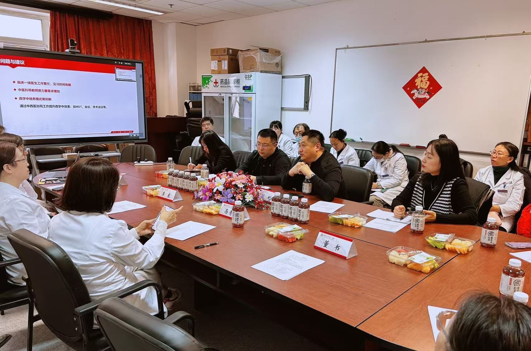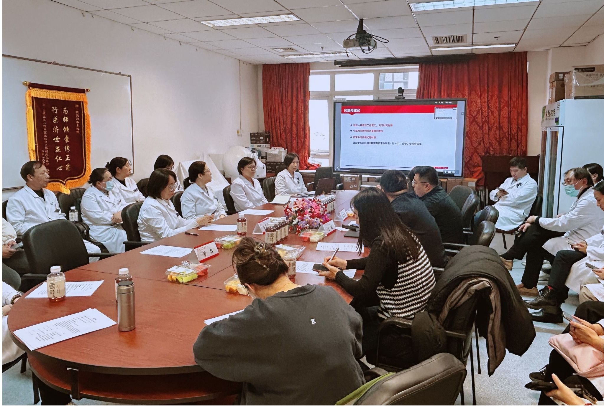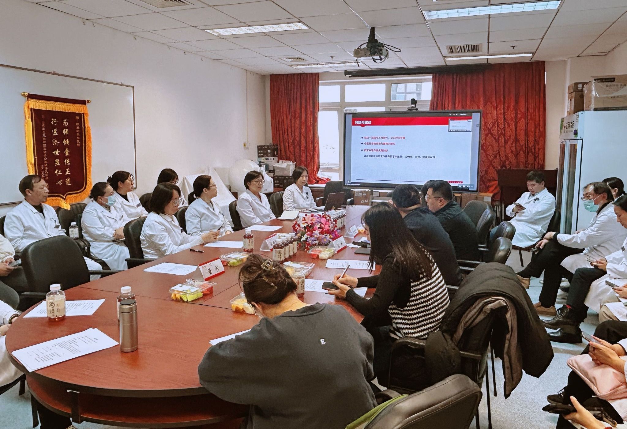 在专题汇报阶段,北医三院医务处张亚男系统阐述了医院西学中工作的整体规划、组织实施与阶段性成效,涵盖政策落地、机制构建与人才培养等多方面内容。中医科辛喜艳副主任则详细介绍了西学中培训基地的建设情况,包括基地申报、教学体系构建、师资队伍建设及日常教学安排等,并强调依托中医科优质教学资源、药剂科学科室优质教学资源,为来自北京市各医疗机构的西学中学员提供系统化、高质量的中医教学与实践支持。随后,全科医学科、肿瘤放疗科分别分享了参与相关专业委员会筹建的初步设想与规划,展现了各科室在中西医结合临床与学科建设方面的积极探索。自由讨论环节中,与会人员围绕中西医协同诊疗模式创新、西学中培养体系优化、临床工作与学习培训的统筹、师资队伍提升以及专业委员会职能定位等议题展开热烈讨论,在多学科协作、线上线下混合式培训、专委会与学科发展融合等方面提出了多项可行性建议,进一步凝聚了合作共识。