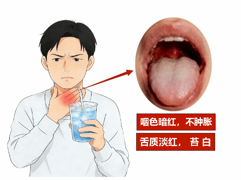 症状:此类咽痛剧烈,甚者咽痛如刀割,也就是大家常说的“刀片嗓。遇冷则痛势加剧,得温则稍有缓解,咽部色暗红、不肿胀,此为该证核心特征。可伴畏寒怕冷等表寒表现。舌质淡红,苔白,脉象紧或弦紧。